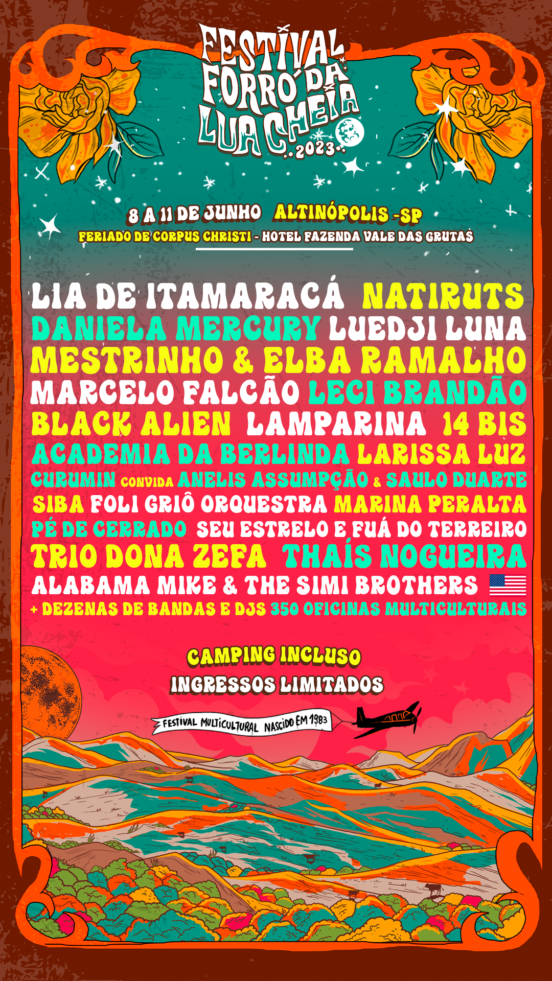 Serão 4 dias de camping e 80 horas de programação, que serão divididas em 6 palcos, envolvendo 100 atrações musicais e 350 oficinas formativas e de vivências multiculturais, espetáculos e intervenções, bem como, programação voltada ao público infantil, tudo isso incluso no valor do ingresso! Confira abaixo algumas atrações confirmadas.